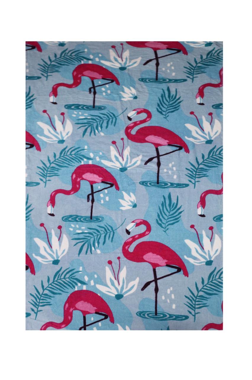 This eye catching towel features a vibrant pattern of pink flamingos in graceful poses, surrounded by white tropical flowers and lush green palm leaves. Set against a soothing mix of light and medium blue backgrounds, the design captures the beauty of a serene tropical lagoon, perfect for adding a splash of summer style to your beach or pool days.